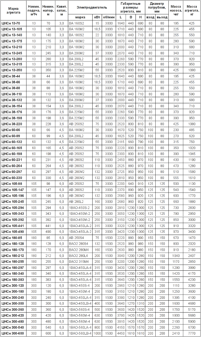 Технические характеристики насосов ЦНС, ЦНСГ, ЦНСП